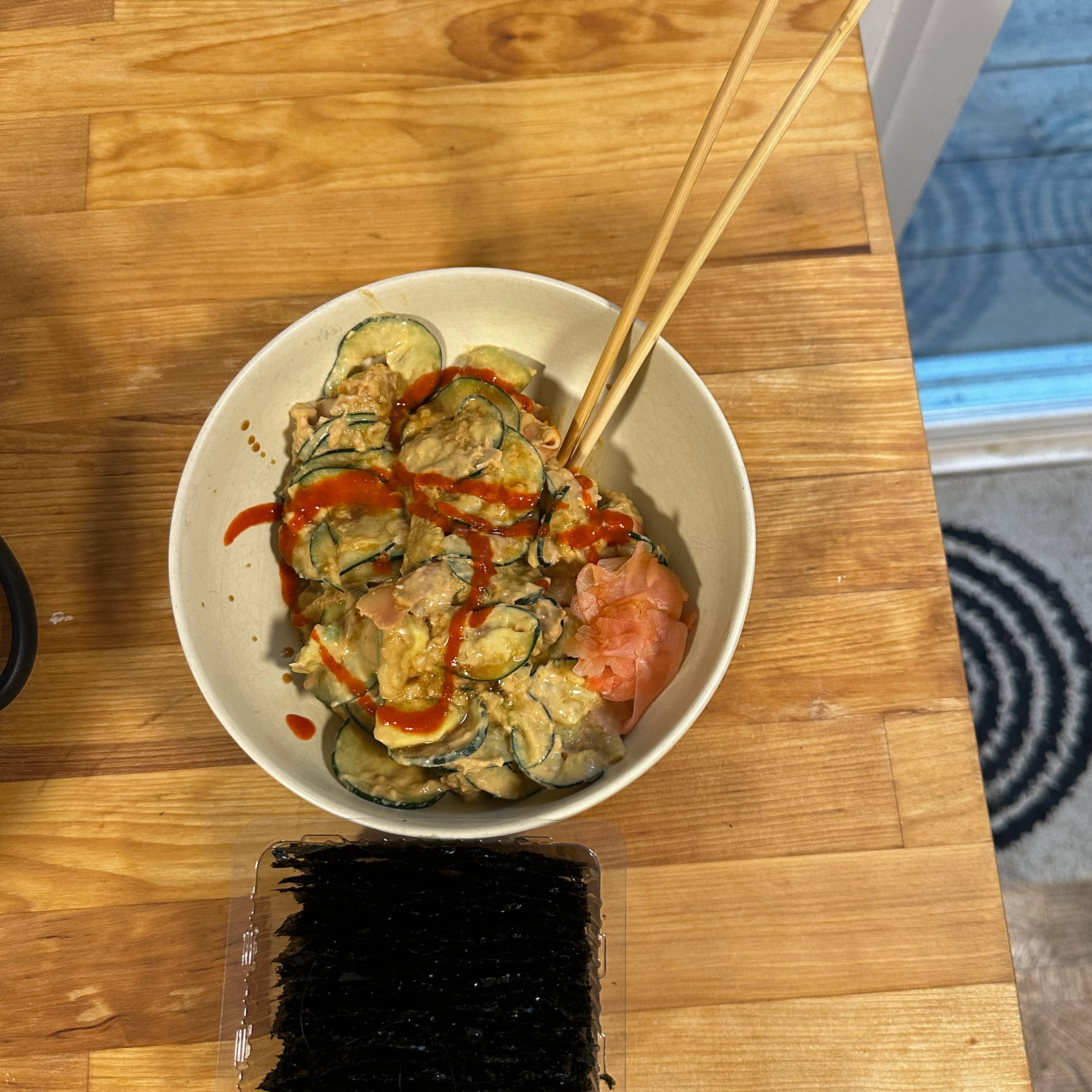 Aggressivly mix all ingredients (except for nori) in a mixing bowl. Hold back a bit on sauces in the beginning and add to taste as needed.